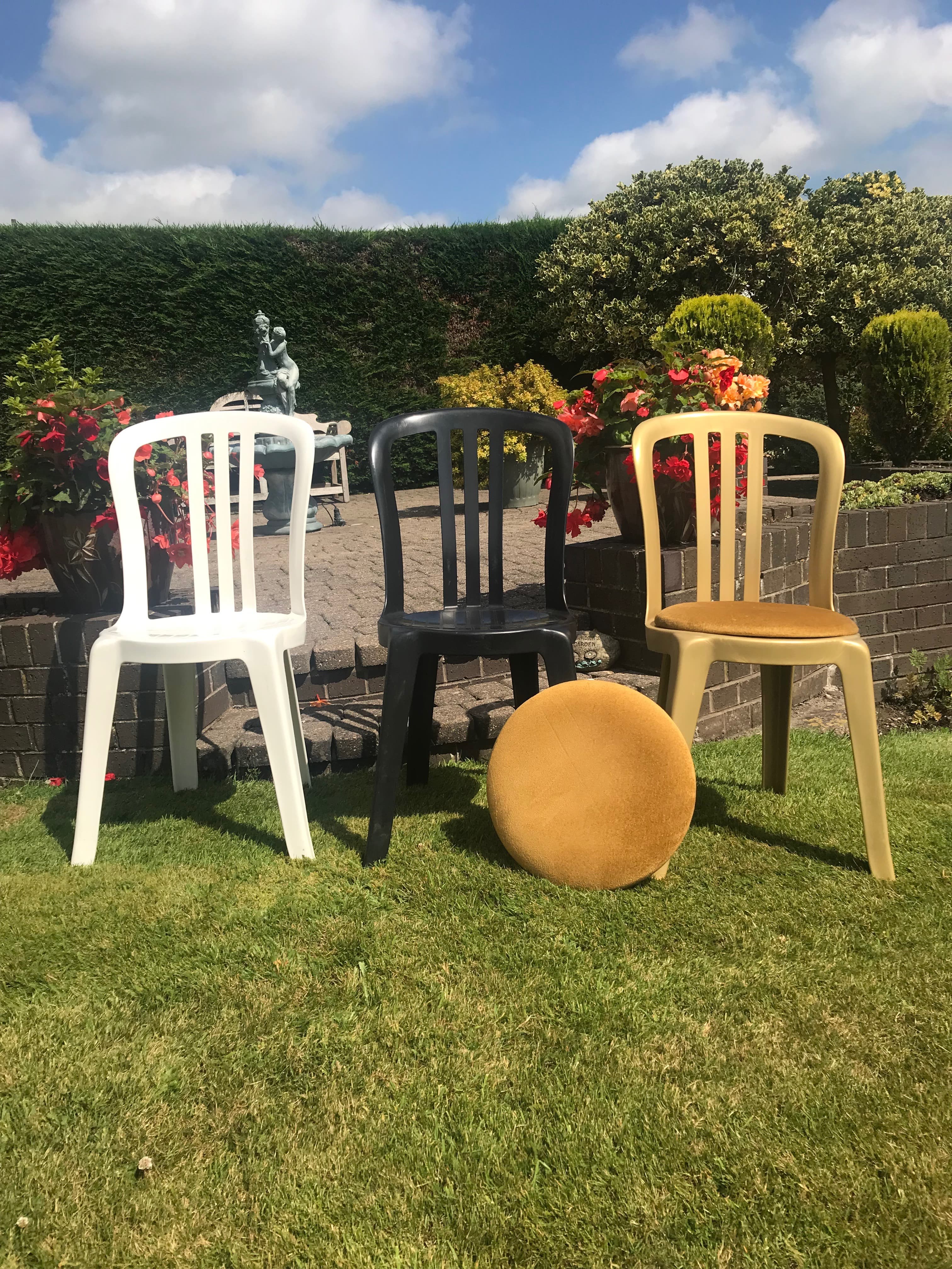 Black, White or Gold Plastic Bistro Chairs (with or without Gold Seat Pad)